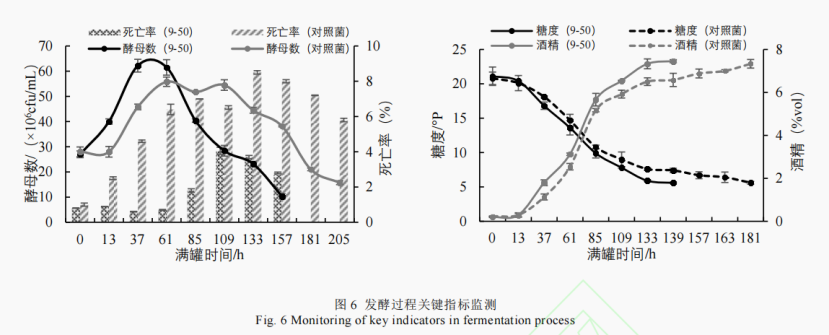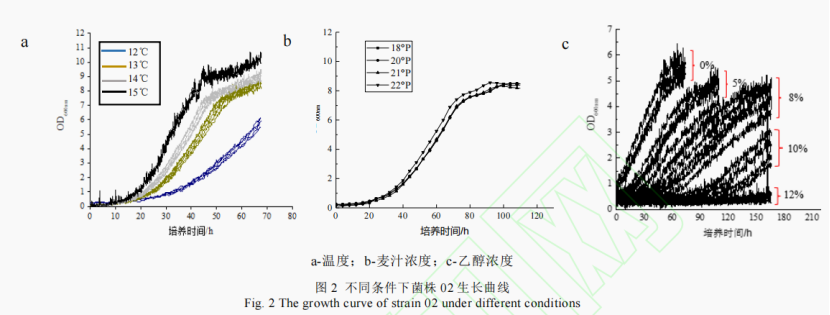 本研究建立了基于液滴微流控技术的啤酒酵母高通量筛选方法,并以啤酒酵母Saccharomyces pastorianus 02为出发菌株,经ARTP诱变,液滴微流控酒精初筛,α-葡萄糖苷酶和乙醇脱氢酶Ⅱ活力复筛,发酵实验,获得了遗传和发酵稳定性良好的超高浓啤酒酿造菌株9-50。与出发菌株相比,其在中试规模下增殖旺盛,发酵周期缩短42h,并可适应 9%vol高乙醇浓度环境,发酵度达66%以上,双乙酰含量0.06 mg/L,醇酯香气较协调,具有较好的工业应用前景。