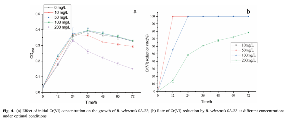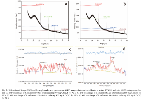 在本研究中,从四川的废铬渣中分离出一株抗Cr(VI)的细菌LYB-23,经鉴定为贝莱芽孢杆菌(Bacillus velezensis)。通过驯化提高LYB-23的铬耐受性(将培养基中的铬浓度从60 mg/L持续增加到200 mg/L),随后使用常压室温等离子体(ARTP)技术进行菌株诱变,诱变时间为90s,筛选得到突变株B.velezensis SA-23。铬对贝莱芽孢杆菌的最低抑制浓度从原始菌株的80mg/L增加到驯化菌株的200mg/L和突变菌株的400mg/L。Cr(VI)还原实验结果表明,SA-23可以在24h内完全还原100 mg/L Cr(VI),200 mg/L Cr(Ⅵ)的还原率在72h内达到78.45%。X射线衍射(XRD)分析表明,ARTP诱变未改变Cr(VI)还原吸附后细菌表面官能团的类型和Cr(III)的结晶状态,但改变了细菌的生物形态,并大大增强了磷酸基团在吸附和还原Cr(VI)过程中的作用。
