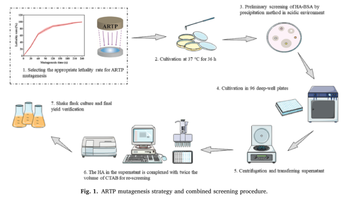 透明质酸是糖胺聚糖(GAG)家族成员,由N-乙酰葡糖胺(GlcNAc)和D-葡糖醛酸(GlcA)组成,它们通过交替的β-1,3和β-1,4糖苷键连接。HA作为一种优异的天然生物聚合物,已被广泛用于医疗、美容和临床应用。通过微生物发酵生产HA是一种理想方法,具有工艺流程简单、纯化程序便捷的特点。ARTP是一种新型微生物筛选诱变系统,并已应用于100多种天然微生物,在优化各类微生物性能方面的作用较为强大。