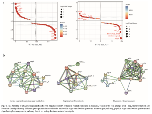 本研究揭示了兽疫链球菌HA生物合成增强的遗传机制差异。经过多轮ARTP诱变,结合新型牛血清白蛋白/十六烷基三甲基溴化铵偶联高通量筛选,在摇瓶培养18h内,突变株的HA产量提高了42.9%,达到0.813 g/L,分子量为0.54×106Da。通过在5L发酵罐中分批培养,HA产量提高到4.56 g/L。转录组测序结果显示,不同突变株之间具有相似的遗传变化,均通过增强HA的合成基因(hasB、glmU和glmM),削弱UDP-GlcNAc的下游基因(nagA和nagB),并显著下调壁合成基因的转录,从而使两种前体(UDP-GlcA和UDP-Glc NAc)的积累分别增加39.74%和119.22%。将有效的筛选方法与组学分析相结合,探索不同突变株之间的共同基因调控因子,可能为挖掘复杂的HA调控途径提供更多的控制位点。