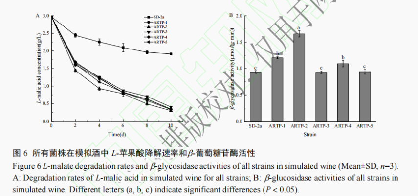 本研究为选育出高度耐酸性酒酒球菌突变菌株,研究其胁迫耐受性能及苹果酸-乳酸发酵能力。以酒酒球菌SD-2a 为出发菌株,通过ARTP诱变技术,筛选高耐酸性酒酒球菌突变菌株,并探究其乙醇耐受性及在模拟酒和葡萄酒条件下的 MLF 能力。经过ARTP诱变处理后,利用 pH 3.0 的胁迫传代培养和分离纯化等,获得了5 株 β-葡萄糖苷酶活性较好的耐酸突变菌株,且在高乙醇浓度下表现出了较好的耐乙醇性。其中突变菌株 ARTP-2 在模拟酒中的 β-葡萄糖苷酶活性和 L-苹果酸累积降解量最高,且其在葡萄酒中 L-苹果酸降解速率快于出发菌株,在第18 d完成 MLF,发酵后的葡萄酒香气成分的含量显著高于接种 SD-2a 的酒样。突变菌株ARTP-2 具有良好的胁迫耐受性和 MLF 能力,对葡萄酒的香气起到积极的作用,为进一步开发优质的 MLF 商业发酵剂奠定基础。