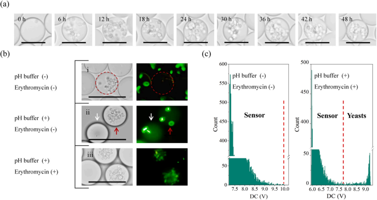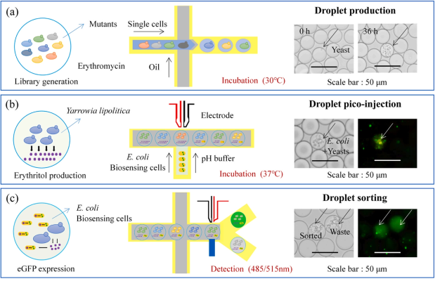 在本研究中,研究团队利用响应赤藓糖醇的转录调控因子,设计了一种新型生物传感器,实时监测赤藓糖醇的浓度。结合FADS,构建FADS-TF共表达体系(图1),利用液滴微流控的超高通量筛选高产赤藓糖醇的解脂耶氏酵母。该筛选流水线包括三个液滴操作步骤:酵母单细胞液滴的产生和孵育,微注入基于荧光的赤藓糖醇生物传感大肠杆菌,分选出荧光信号最高的1‰的液滴(图2)。基于微液滴的工作流程,对液滴进行了两阶段的温度和pH控制策略,以分离赤藓糖醇的生产和检测过程。然后利用pH敏感的红霉素消除了生物传感器的背景表达,最终建立了完整的共培养筛选系统(图3)。