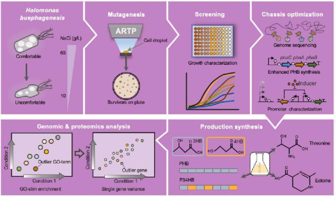 本期为您推荐清华大学合成与系统生物学中心主任陈国强教授团队发表在Metabolic Engineering 上的一篇文章:Engineering low-salt growth Halomonas Bluephagenesis for cost-effective bioproduction combined with adaptive evolution 。 本研究采用常压室温等离子体技术(ARTP),对蓝晶盐单胞菌进行随机突变,筛选得到在低盐浓度下生长良好的菌株。对获得的优势菌株进行发酵生产PHA,实现了高产与成本降低的双重增益。对比突变菌株与野生型基因型,揭示了嗜盐宿主菌株的盐胁迫相关基因。