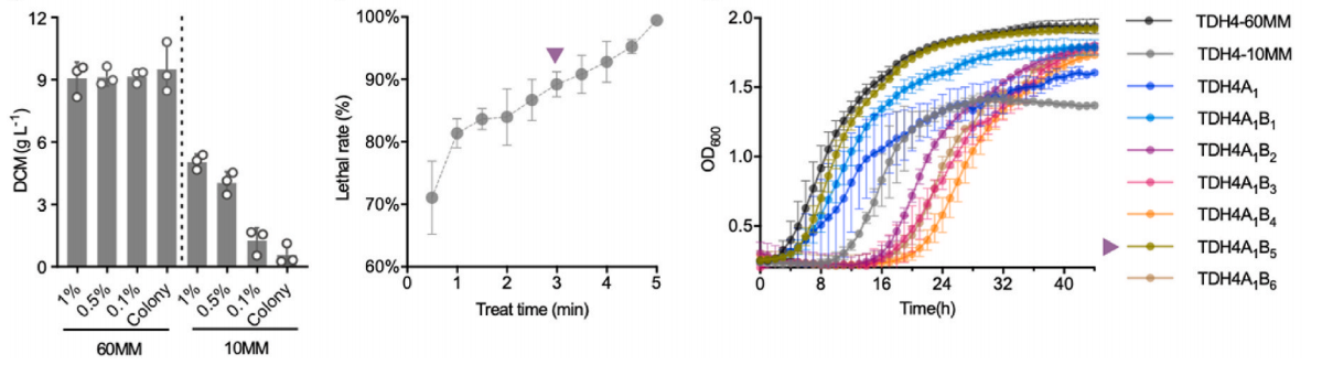 研究人员以野生单胞菌TD01及3个重组菌TDH4,TD68,TD68-194为出发菌株,分别验证其在高浓度(50g/L NaCl)和低浓度(10g/L NaCl)盐环境下的生长状况,结果显示所有菌株在低盐浓度的平板中均未出现菌落(图2)。对这4株菌进行ARTP诱变,诱变时间5分钟,致死率曲线显示最佳处理时间为3分钟(图2)。在诱变后的库中筛选出4株在低盐浓度情况下生长最迅速的菌,进行第二轮诱变,最后得到4株菌: TD01A2B5, TDH4A1B5, TD68A2B3 and TD68-194A1B5(图2)。 其中TDH4A1B5菌具有最优良生产性能,细胞干重可以达到11g/L,含有60%质量百分比的PHA产量。