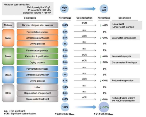 对突变菌株TDH4A1B5进行基因水平的改造,加入phaCAB操纵子,增强代谢通量,在7L体系中进行的40小时未灭菌补料分批发酵,相较于野生型的PHB和P34HB产量分别增加了21%和36%(图3)。进一步对其进行改造使得苏氨酸分泌率和外泌素分泌率分别提高了50%和77%,多方面的解析显示了其低盐浓度底盘菌的应用潜力(图4)。通过基因比对,揭示了嗜盐宿主菌株的盐胁迫调控机制,包括101个与渗透压相关的基因。更重要的是,通过使用重组嗜蓝菌TDH4A1B5,在7L发酵体系下的PHA的成本降低了1/3,这显著提高了其经济竞争力(图5)。
