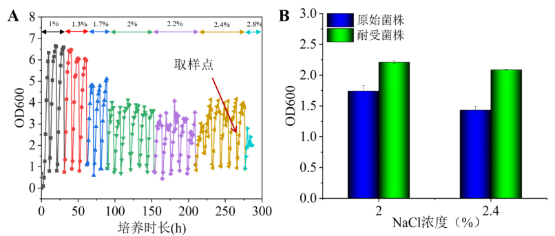土壤盐碱化已成为与人类生产活动相关的全球性问题。在高盐条件下,植物的光合作用、呼吸和离子运输等代谢活动受到很大影响,导致生长迟缓、产量下降甚至死亡。在工业发酵过程中,通常需要向反应器中添加高浓度的糖或矿物质,在此过程中微生物容易发生高渗胁迫,导致生长和生产力降低。因此,如何提高生物体对恶劣环境的耐受性成为工业生产活动中的关键问题。传统微生物的适应性进化通常将微生物置于具有特殊条件的培养环境中(如特殊底物、高渗透压、pH值等环境),依靠研究人员反复挑选生长较快的微生物,但存在时效性差、工作量大的问题,驯化效果往往也不尽人意。