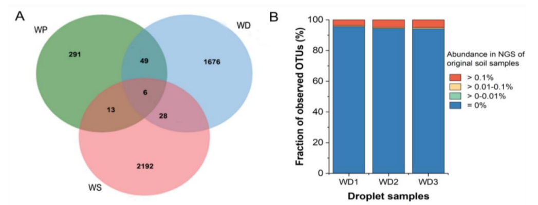 研究人员采集来自贵州省毕节市某魔芋种植区表面10 cm下的土壤样本,分别采用液滴体系与培养皿体系进行微生物资源探查。镜检结果显示含菌液滴数量约占总液滴数量的12.22%,液滴中菌落数与平板数量基本一致,表明菌株在液滴中的生长与平板培养具有相当水平(图2)。对不同培养条件下得到的菌落进行分析发现,液滴培养样品中95%以上的OTU属于稀有生物圈,其相对丰度在原始土壤样品中低于0.01%(图3),这表明液滴培养在揭示复杂微生物群落中罕见生物圈方面具有巨大潜力。