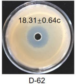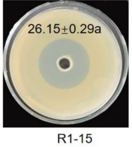 最后基于该高通量模型,对土壤环境复杂样本进行拮抗菌株的筛选。以每小时105个细胞速率进行分选,分选后的液滴涂布至平板,选取单菌落通过琼脂扩散法验证其对病原指示菌Ecc15的抑菌能力。经过筛选,32株具有抗菌活性的细菌被富集,其中最佳菌株的抑菌直径达到20.86±1.56 mm。经过ARTP诱变,抑菌直径进一步扩大至26.15±0.29 mm,显著大于出发菌株的18.31±0.64 mm(图6),抑菌活性提升62%。