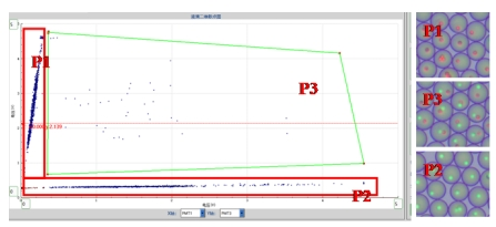 2、在二维散点图中,分别对P1、P2、P3液滴群体进行圈门,分选,对收集到的液滴进行镜检观察,如下图:P1群体分选得到的为红色荧光微球,P2群体分选得到的为绿色荧光微球,P3群体分选得到的为共包裹红色荧光微球和绿色荧光微球的液滴,符合预期;