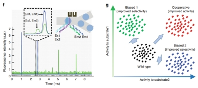 对于目标样品的多种不同荧光信号的同时检测和分析在高通量筛选研究中具有重要作用,如多功能酶进化研究、蛋白互作研究、免疫细胞筛选研究、多种荧光PCR研究,抗体筛选等,其中酶进化研究的典型案例如下图所示: