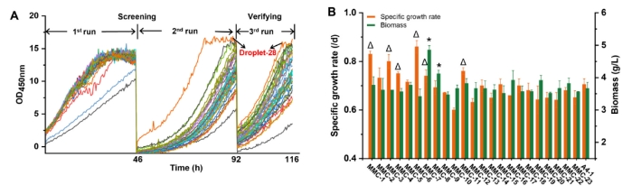 在MMC体系中,初始生成50个液滴,每一代运行时间在24-46小时,实时检测液滴在450 nm处的吸光值,表征藻株生长情况。经过三轮培养,筛选出长势好的液滴(第28号液滴)。整个实验流程仅耗时116小时,相较于传统平板体系有着较大的提升(图 2A)。将液滴进行单克隆分选,得到23株菌,选取其中4株(MMC-1、7、8和11)生长速率或者生物量浓度较高的进行后续的分析(图 2B)。
