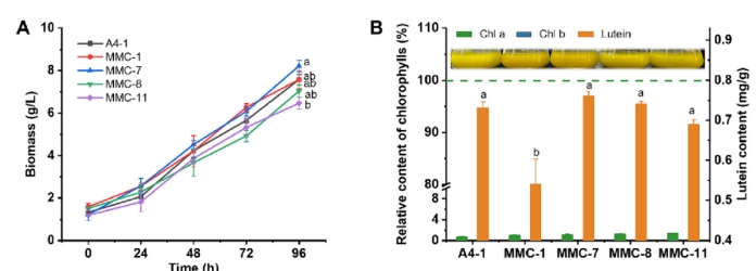 在250 mL摇瓶中培养的四个选定突变体(MMC-1、7、8、11)的细胞生长和生物量产量如图 3A所示。所有突变体的生长模式与A4-1藻株相似,均经历了初始滞后期,随后迅速进入指数生长期。MMC-7达到了最高的生物量浓度8.21 g/L,比A4-1菌株的7.57 g/L高出8.49%(p < 0.05)。同时所有四个突变体在视觉上都呈现出与A4-1藻株相似的金黄色,未检出叶绿素b,叶绿素a仅占野生型(WT)的1%(图 3B)。