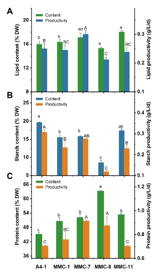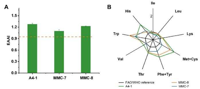 生化成分分析显示,在四个突变体中,蛋白质含量增加了12%至40%(图 4)。MMC-8突变体显示出了最高的蛋白质含量(63.26%干重)和低的淀粉含量(8.59%干重),比出发藻株A4-1分别增加了40.11%和减少了56.24%。此外,MMC-8在蛋白质质量上也表现出色,其氨基酸含量(44.35%干重)和评分(95)均高于A4-1。
