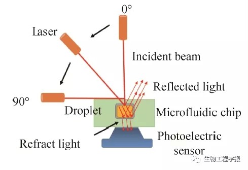 在液滴微流控系统中,对每个液滴的快速正确识别是对微液滴进行精准操作的前提。Jakiela等采用机器视觉方法,通过摄像机对芯片进行图像采集,利用其开发的“边缘识别”算法,实现对芯片内微液滴的精确识别[9]。但该方法需要光源照明,会严重干扰本研究中的光谱信号检测,同时所需配套设备较为昂贵复杂,不易实施,因此需要开发一种快速简易的油水识别系统,并且不对光谱信号采集产生干扰。液滴微流控系统中的水相和油相均为无色透明液体 (水相可能会因为内容物的变化而出现颜色浊度的变化),光吸收度几乎相同,基于光吸收原理的普通的光电检测系统则无法进行精确识别。考虑到油水两相的光反射率和折射率不同,本研究提出并设计了如下的光电检测系统 (图1):激光以一定的角度斜射至芯片通道检测窗口处,光电探测器置于芯片微通道下方,油相和水相流经该检测窗口处时,由于两者的光反射率和折射率不同,造成光的反射和折射具有较大差异,因此进入光电探测器的光强会产生较大变化,转化输出的电信号具有明显特征,进而实现液滴的快速精确识别。