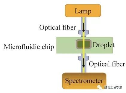 微生物培养过程需要连续监测微生物细胞浓度 (OD) 及底物和代谢产物的变化,以便深入研究其生长和代谢特性。MMC系统中液滴的体积小 (2–3 μL) ,并且全封闭运行,无法取样检测,同时对于生长量较大的微生物更无法进行稀释处理。这就需要一个能够实时在线、大量程的光学检测系统,且易于操作并具有经济性。已报道文献多采用两种方法进行OD检测,一种是将光纤集成于芯片之中,位于通道两侧,当液滴经过时进行检测[9],这个方法对芯片工艺要求较高,芯片制造成本必然会大大增加。另一种方法则采用图像采集,然后进行灰度分析以获取近似的OD数据[14]。但该方法难以对复杂的光谱信号进行分段检测,同时可检测范围有限,影响因素多。为解决上述问题,本研究在微流控芯片的实时在线检测模块开发中,设计了一种基于光纤的新型短光程光谱检测系统 (图2):该系统将光纤与芯片分离,置于芯片两侧,光纤与光源和检测器连接,构成光谱检测通路,微液滴流经芯片的检测窗口处时,其光谱信号被检测器读取和转换,转换信号反馈给上位机进行记录和分析,并匹配到对应编号的液滴中,然后显示在控制软件界面上。这种检测方式操作简单、实时在线检测、稳定性高,并且对芯片制造工艺要求较低,加工成本大幅度降低。