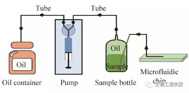 在传统微流控操作过程中,通常通过两种方式将样品引入至芯片。一种是利用注射泵和注射器,先用注射器抽取样品,然后安装至注射泵,通过注射泵推动注射器将样品导入芯片。这种进样方式需要对注射器以及注射泵阀头进行清洗和灭菌,在使用过程中反复拆装,操作繁琐,操作难度大,且染菌风险高[14]。另一种则是利用基于气体介质的压力泵,先将样品放置在密闭瓶子 中,通过压力泵对瓶内压力的控制,将样品泵入芯 片[9]。这种进样方式虽然简单,但极易受系统压力的波动影响,无法精准定量操作。MMC是面向微生物技术应用开发的自动化进化培养装备,上述两种传统操作方式均不能满足本研究的需求,因此,如何开发出既能够简单精确导入样品,又能够便于清洗灭菌的进样系统成为MMC进样技术的关键所在。为此,本研究创造性地将传统的两种进样方式进行了结合,既利用了注射泵进样的精确性,又利用了压力泵进样的便捷性。本研究设计的MMC进样系统如图3所示:该系统由油相、注射泵、进样瓶组成,其核心是进样瓶 的设计,进样瓶顶部有两个管口,中间管口用于油相的进出,侧面管口则用于水相的进出。注射泵通过顶部管口,推动油相进入进样瓶,因为MMC所用的油相密度低于水相,且油相和水相互不相溶,两相在进样瓶中形成稳定的分层状态,进而油相会驱动等体积的水相从进样瓶的侧面管口流出并进入芯片,达到定量向芯片进样的目的。该设计可避免水相物质流经注射器、阀等装置,无需清洗,操作简便安全。同时该系统的组装操作可在超净台中独立完成,能够有效地规避染菌风险,满足后续微生物培养的需求。
