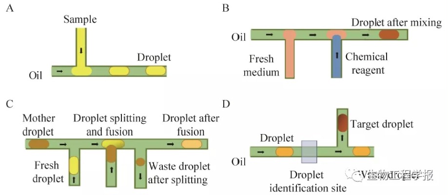图4 液滴操作系统:(A:液滴发生;B:多浓度梯度液滴发生;C:液滴分割融合;D:液滴分选)