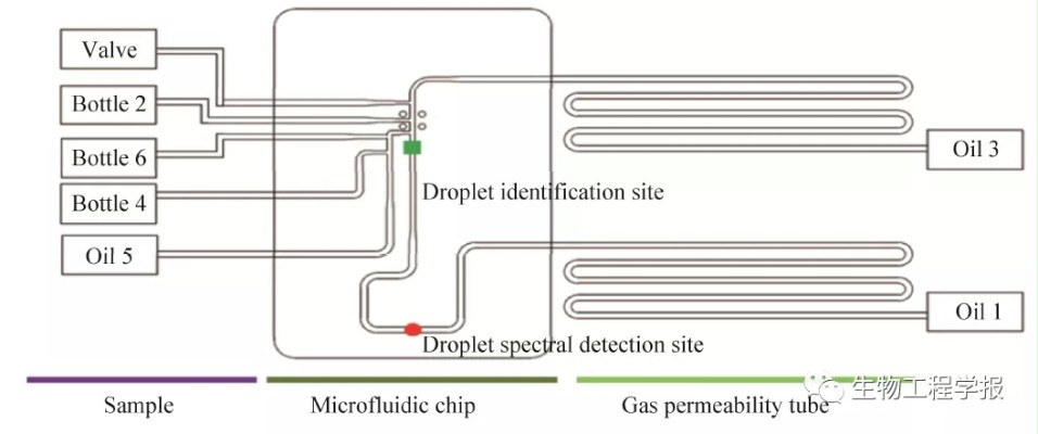 在实现微液滴发生、培养、分割融合、监测、分选的基础之上,本研究对这些功能结构进行了系统集成,形成了功能完备的集成化微流控芯片系统 (图5)。其中2号、4号、6号与进样瓶相连,分别用以盛放种子液、新鲜培养基、化学因子母液。1号、3号、5号均是油相通道,直接与注射泵相连。1号、3号管路为长度为2 m的透气性良好的AF-2400材质管路 (内径=1 mm,外径=1.6 mm)[16],液滴在两者之间进行往复运动。废液管与阀相连,用以排出废液。芯片中的液滴识别点、光谱检测点则分别作为液滴识别窗口和光谱检测窗口。芯片系统整体置于恒温控制仓中,保证微生物培养提供所需的最适温度。