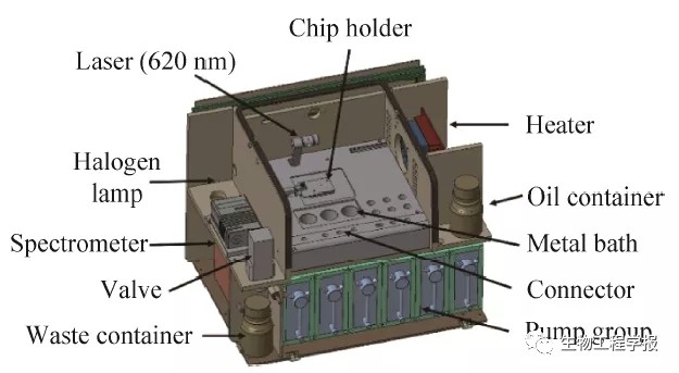 在上述各模块功能基础上,通过光机电一体化结构设计,对各功能模块进行集成和控制系统开发,实现了微生物微液滴的自动发生、往复培养、在线监测、分割、融合、分选等功能的有序操作,整机结构设计如图6所示:卤素灯和光谱仪作为光学检测的功能元件,通过光纤连接至芯片检测窗口处,对运行中的液滴进行光谱数据采集和分析;阀和注射泵组协调联动,构成整机动力模块;芯片系统和进样瓶均分布在操作仓中,并通过加热片对其进行恒温控制;油相瓶和废液瓶分别盛放油相试剂和废液。