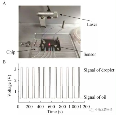 图8 液滴识别系统 (A:装置实物图;B:液滴和油相的电压信号值)