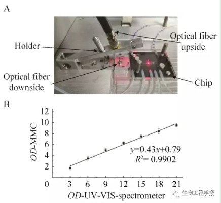 图9 液滴光谱检测 (A:液滴光谱信号检测装置图;B:MMC和分光光度计的中OD600检测数据对比)