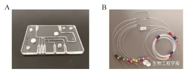 图11 芯片系统实物图 (A:MMC微流控芯片实物图;B:MMC培养管路实物图)