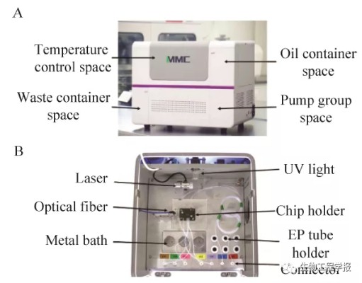 通过对MMC系统各个功能模块的光机电结构一体化设计及集成,最终形成了商业化应用设备 (图12A)。MMC系统操作仓室内部采用恒温控制,芯片和样品均放置在操作仓中。油相试剂放置在油相试剂仓室,运行过程中产生的废液则排放至放置在废液瓶仓室的废液瓶中。MMC仪器下侧的注射泵仓室中放置仪器所使用的6台工业注射泵。在恒温操作仓室内部 (图12B),紫外灯为仓室进行照射灭菌处理,进样瓶放置于金属浴中,可以快速升温并保持稳定,避免瓶子热胀冷缩对进样精度造成的影响,为方便液滴收集,设计EP管支架于仓室内。
