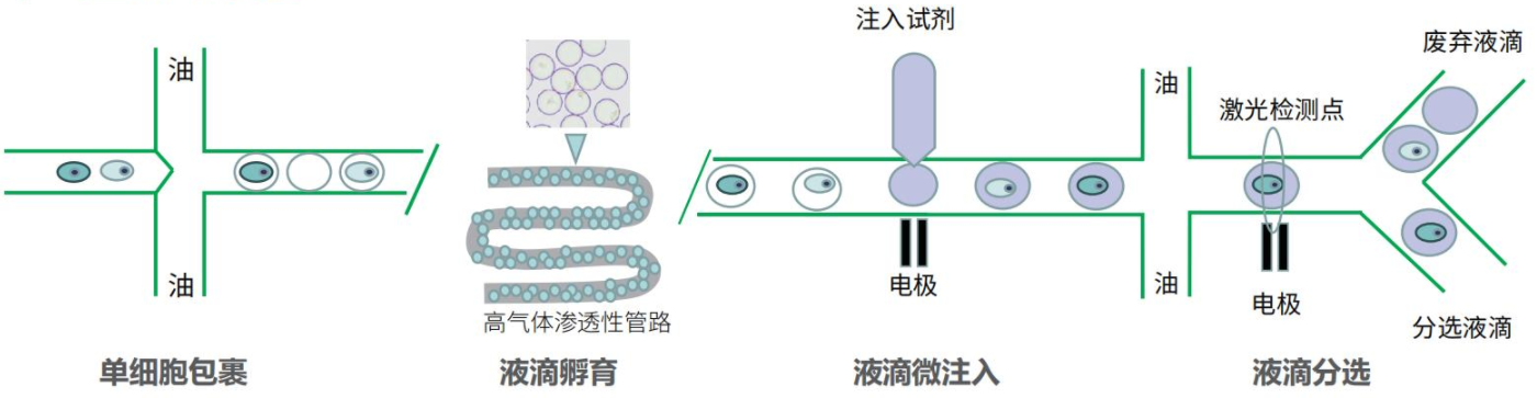 液滴微流控细胞分选仪(droplet entrapping microfluidic cell-sorter)是基于液滴微流控技术开发而成的超高通量单细胞分选平台。通过使用最新的微流控技术,每秒可以发生成千上万的微液滴(pL),细胞包裹于微液滴之中,可进行生长、裂解、代谢、反应等生物生化过程,并与液滴之中的荧光筛子进行充分结合,产生不同强度的荧光信号;之后利用微液滴分选技术将低产出和高产出的细胞通过荧光信号分选出来,实现分选过程的高通量化。