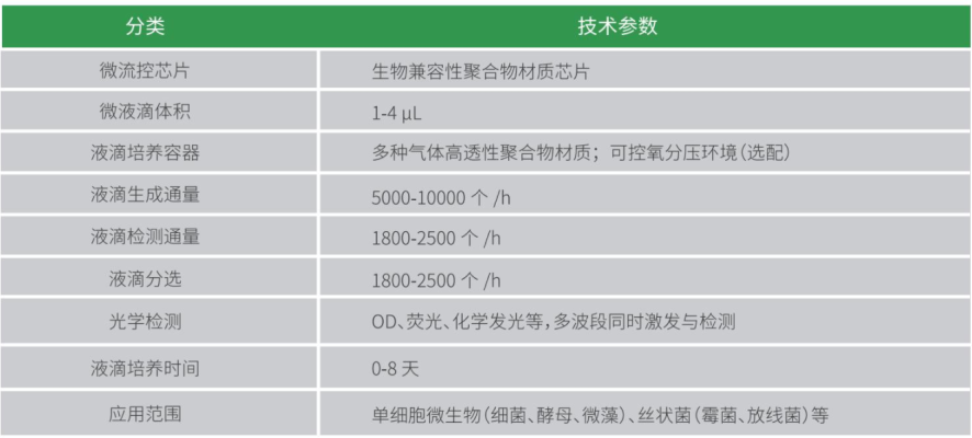 高通量微升级液滴培养组学系统(single cell microliter-droplet culture omics system, MISS cell omics system)是基于液滴微流控技术开发的微型化高通量单细胞培养及分选装备,可以实现对环境菌群在单细胞水平上进行分离培养,并分选保存至多孔板中,形成双重备份。单次运行实现可以处理约5000个液滴(500个单克隆),液滴生成后存储于高透气性管路中进行孵育(0-8天),最后通过光学信号(OD、荧光、化学发光等)进行检测分选,分选后的液滴进入多孔板中并且可以形成双重备份。